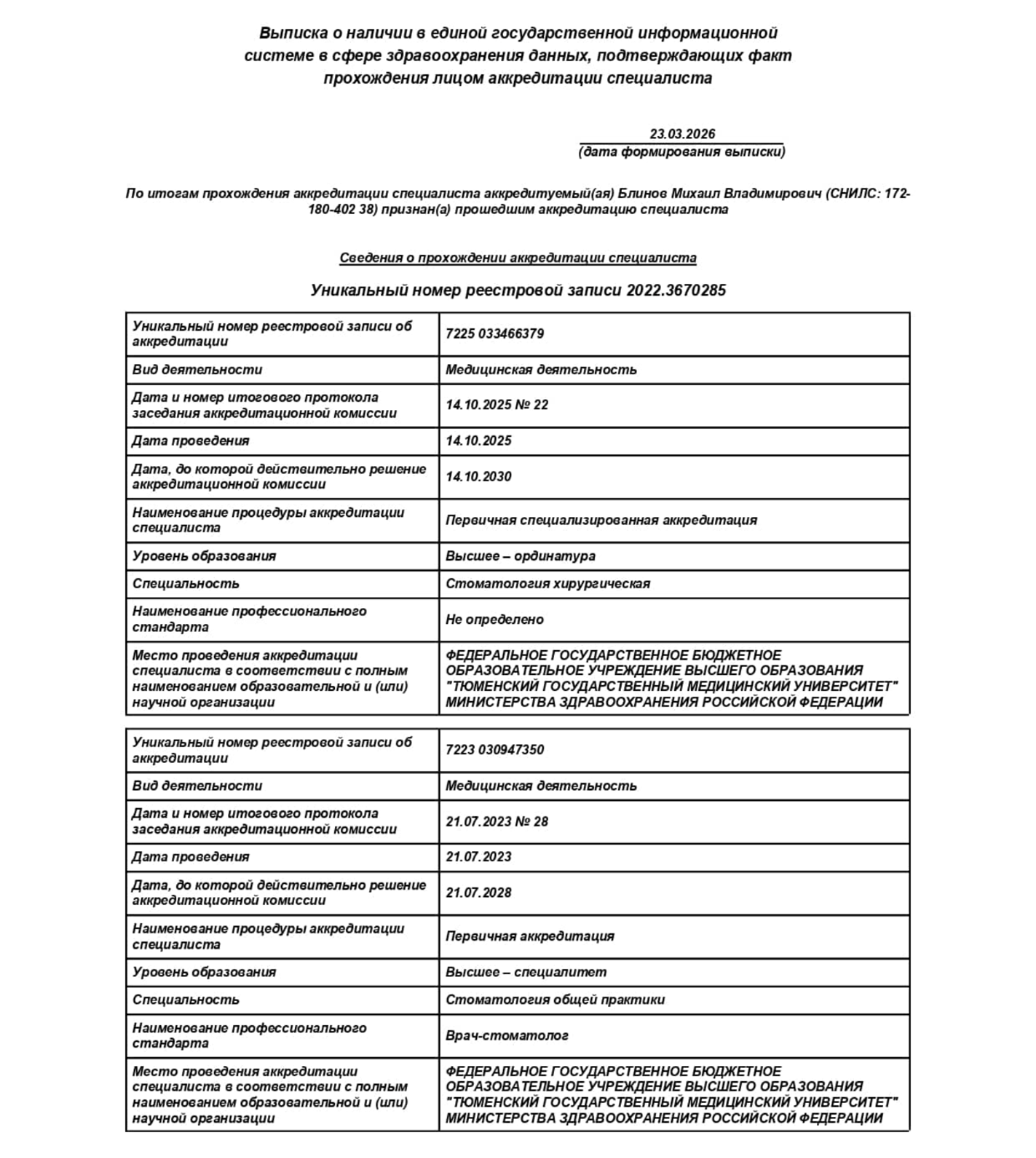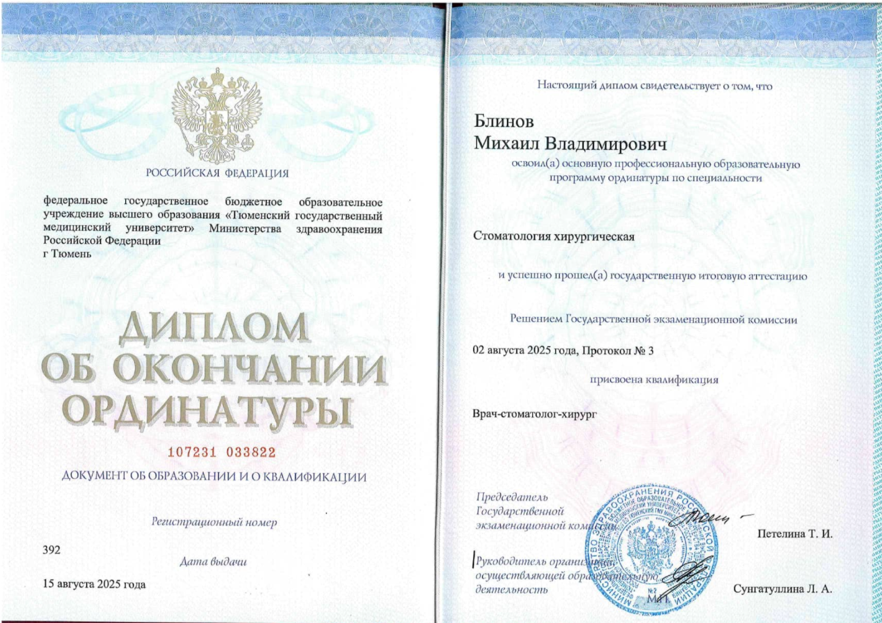 Квалифицированный стоматолог-хирург и имплантолог, обладающий глубокими знаниями и обширным практическим опытом в области хирургической стоматологии и дентальной имплантации. В 2024 году его профессионализм, внимательность и высокие результаты лечения были отмечены пациентами: доктор вошел в ТОП-3 стоматологов Тюменской области по версии авторитетного портала ПроДокторов.