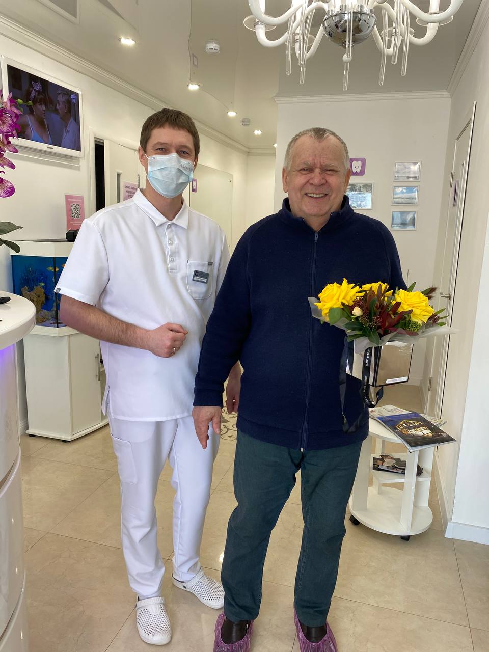 Пациент положительно оценил результат на верхней челюсти и готовится к протезированию нижней челюсти по аналогичной методике (полный съёмный пластиночный протез).